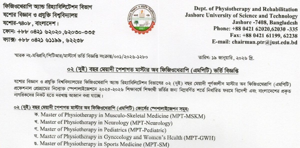 যশোর বিজ্ঞান ও প্রযুক্তি বিশ্ববিদ্যালয়ের ফিজিওথেরাপি অ্যান্ড রিহ্যাবিলিটেশন বিভাগের ০২ (দুই) বছর মেয়াদী পূর্ণকালীন মাস্টার অব ফিজিওথেরাপি (এমপিটি) প্রফেশনাল প্রোগ্রামের নিন্মোক্ত স্পেশালাইজেশনে ২০২৫-২০২৬ শিক্ষাবর্ষে শিক্ষার্থী ভর্তির জন্য বিজ্ঞপ্তিতে প্রকাশিত শর্তে নির্ধারিত ফরমে বিদেশী এবং বাংলাদেশের প্রকৃত নাগরিকদের নিকট হতে দরখাস্ত আহ্বান করা যাচ্ছে।